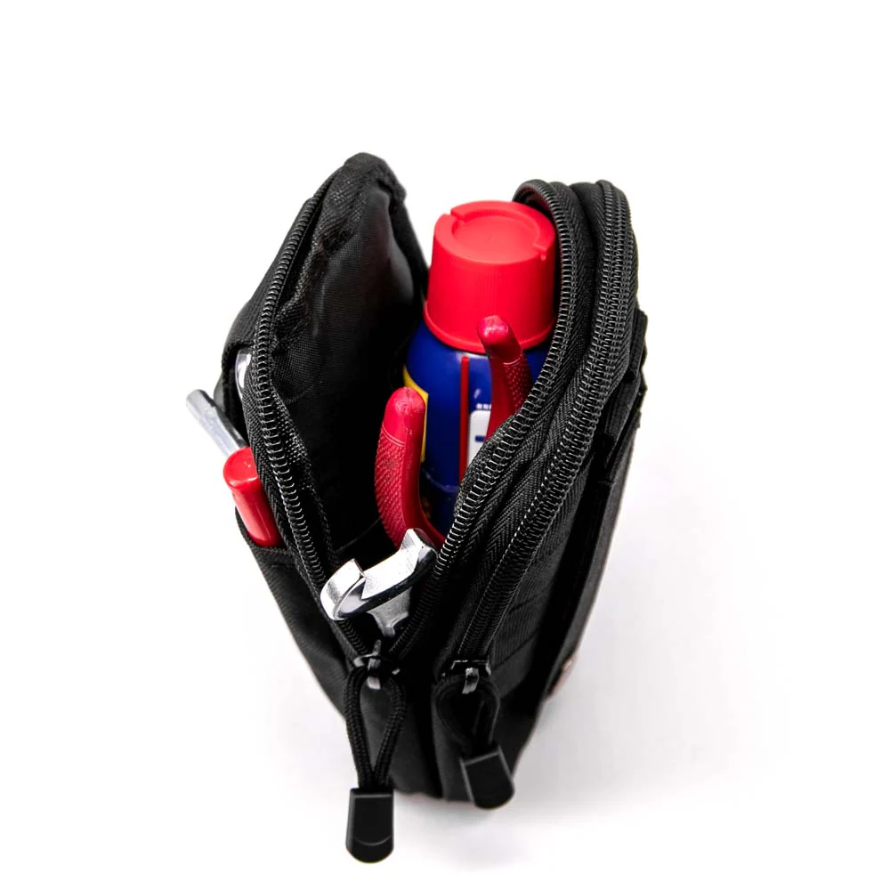 - The small tool bag can be attached to the backpack or the belt and fits snugly to your trouser's waist.