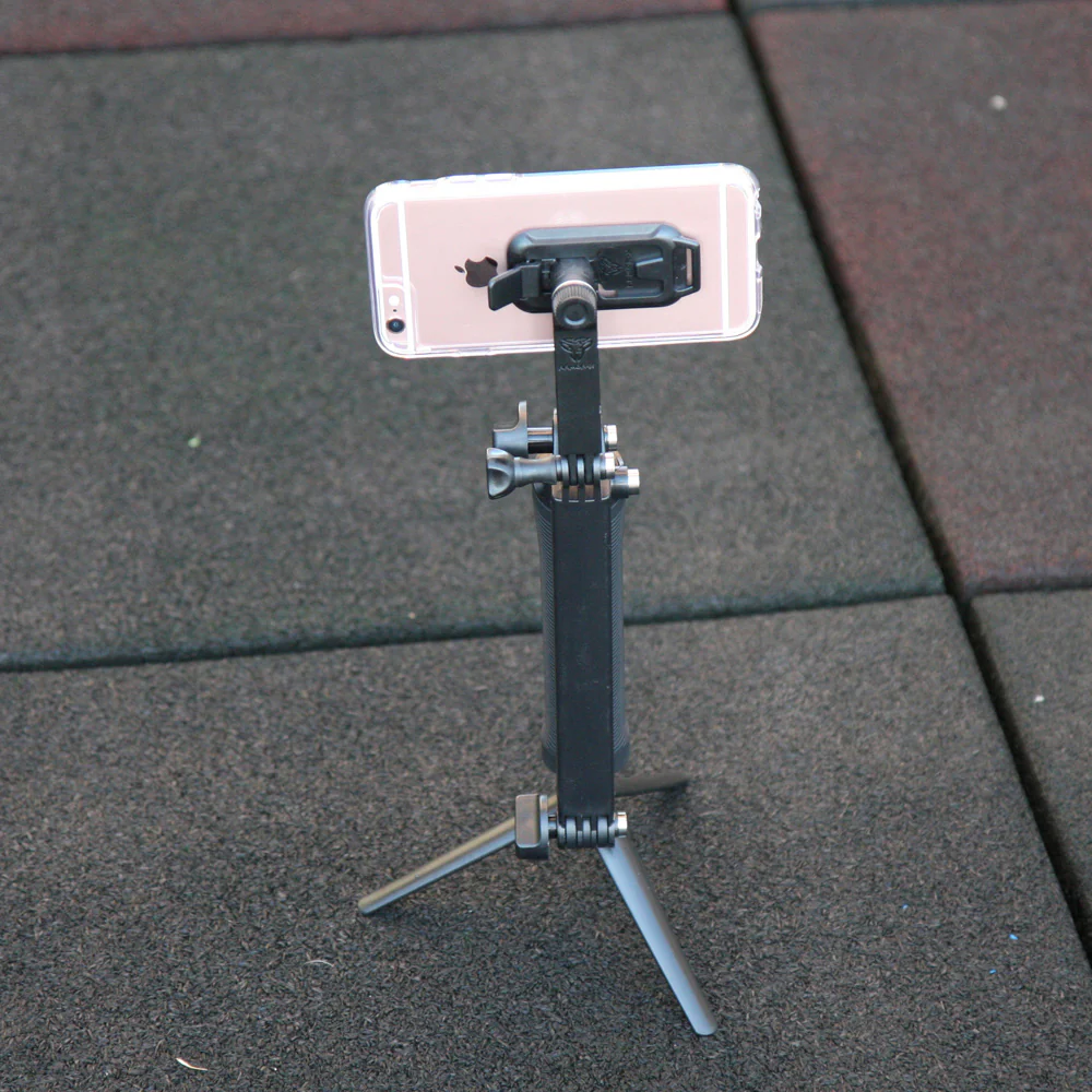 - Camera grip, foldable extension arm, and low angle shot stabilizer.